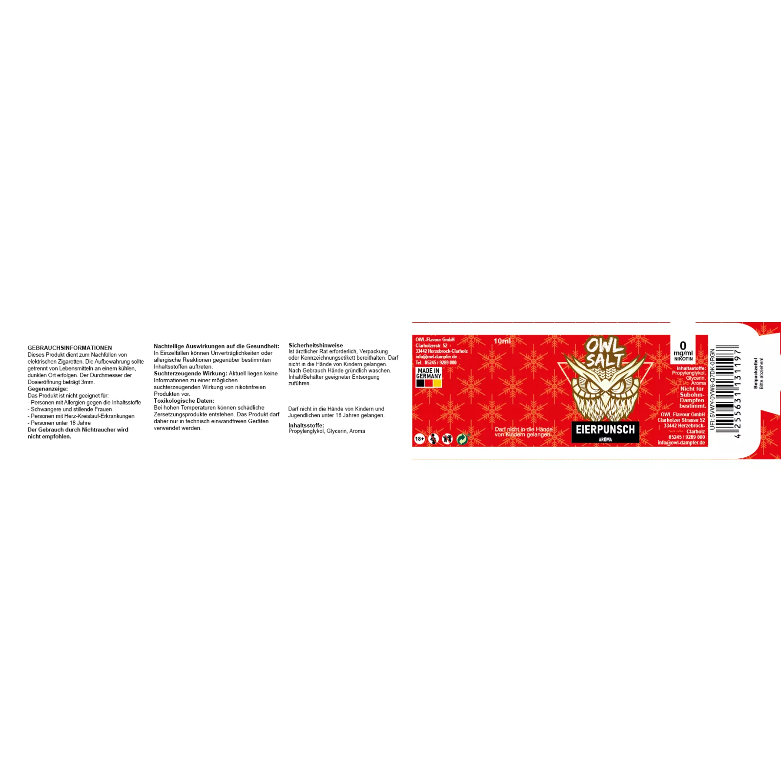 - Made in Germany, garantiert das OWL SALT Eierpunsch E-Liquid höchste Qualität und Sicherheit. Es erfüllt alle relevanten Standards und wurde unter strengstens Qualitätskontrollen hergestellt.
