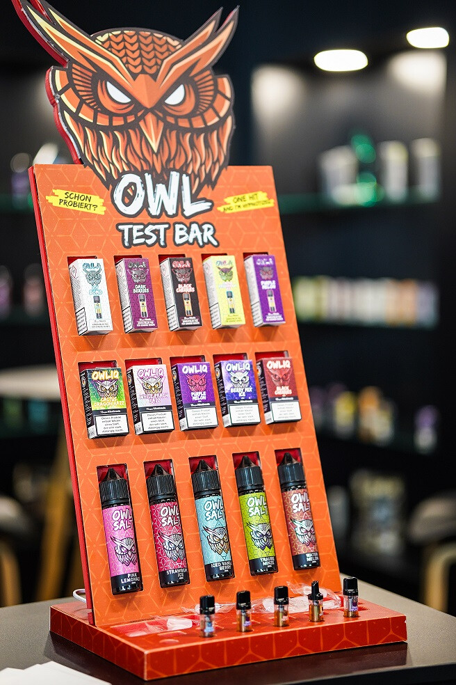 1x Testbar mit den 5 Top-Sorten Inklusive je einer Auswahl unserer beliebtesten OWLIQ FROZEN OWL und NON SALT Liquids – ideal zum direkten Verkosten vor Ort.