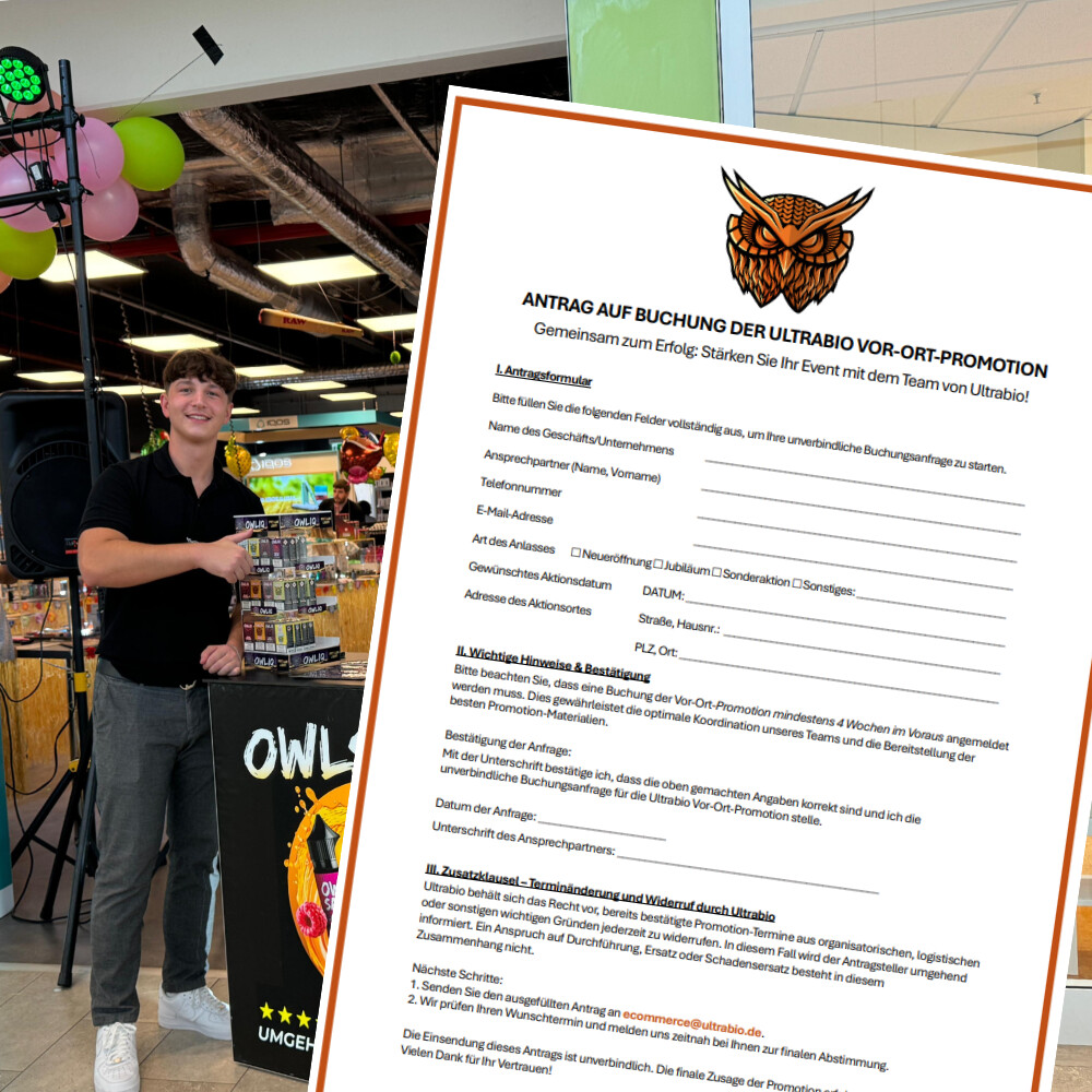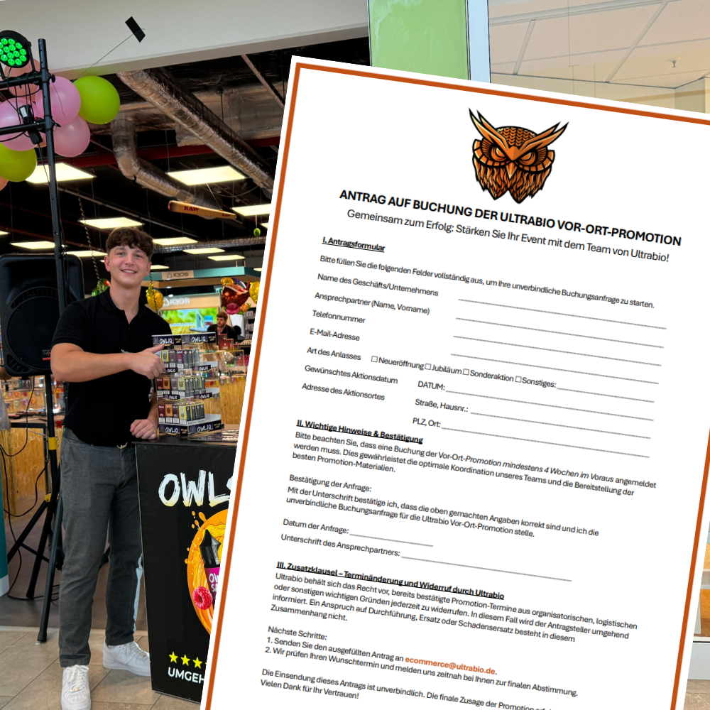 Bei der Vor Ort Promotion unterstützen wir Sie direkt am Point of Sale mit einem geschulten OWL Promotion-Team. Wir besuchen Sie in Ihrem Store, bringen das nötige Equipment mit und präsentieren die OWL-Produkte professionell – mit Testbar, Beratung und viel Aufmerksamkeit. Sie müssen sich um nichts kümmern – wir sorgen für das perfekte Markenerlebnis vor Ort.